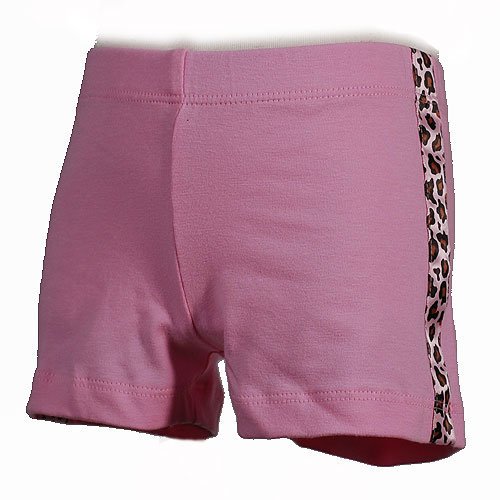 Pink dance shorts by Reflections. Perfect dance, ballet or gymnastics shorts for your little girl. These boy cut shorts feature a leopard print on the side.