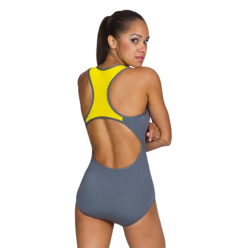 This tank leotard by Natalie features an open back with a sporty contrast racer back and basic scoop front. Other features include shelf lining and a ballet cut leg line. Hand wash in cold water, hang dry.