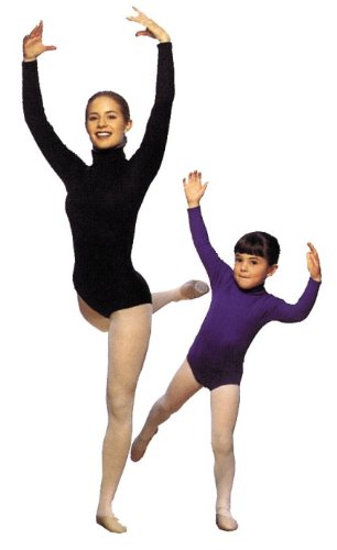 Zipper back leotard has folded-down turtleneck stitched near zipper. Long sleeve ballet-cut leg.