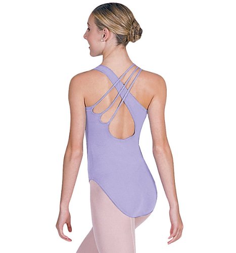 This unique camisole leotard by Natalie has an asymmetrical back with a triple strap design. Shelf Lining. Hand wash in cold water, hang dry.
