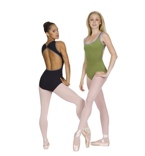 Natalie's tank leotard features a flattering open back with a top pinch detail and contrasting trim. Other features include a basic scoop front, shelf lining and a ballet cut leg line. Hand wash in cold water, hang dry.